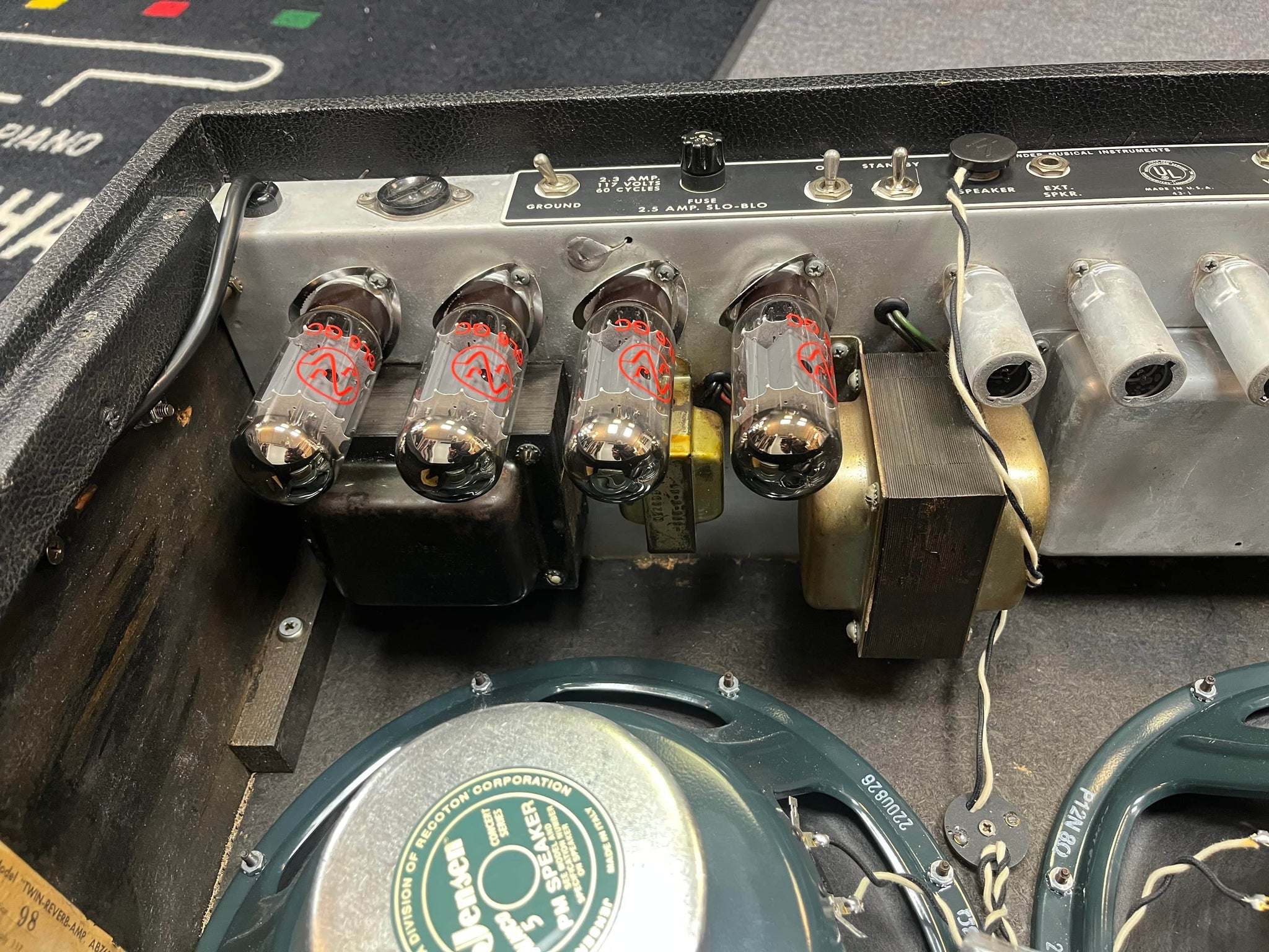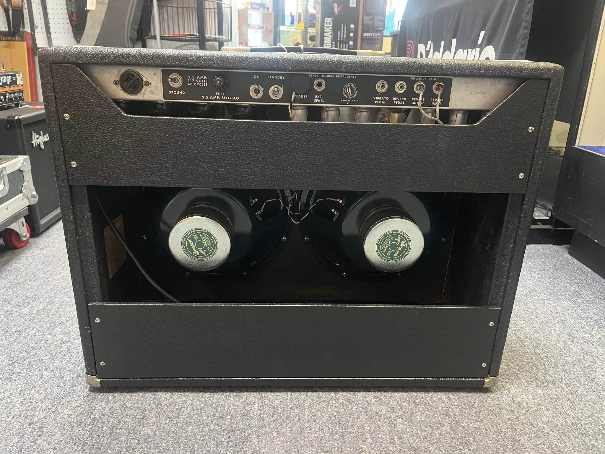 Loaded with Jensen Alnico speakers with green labels, made in Italy. They have a lively, musical response with a smooth top end and a tight low end, which pairs beautifully with the Twin’s high headroom and reverb.