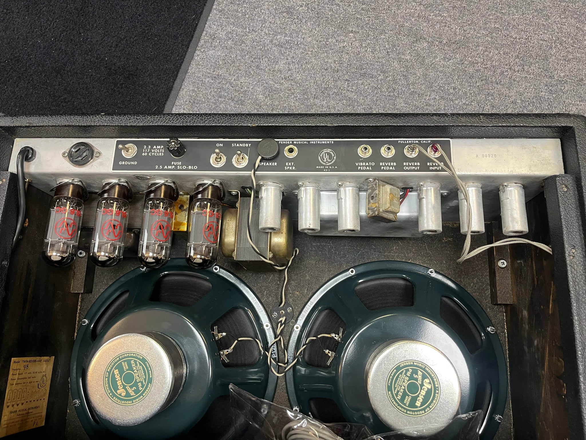 Vintage Fender Twin Reverb amplifier from the blackface era, finished in the classic black, gold, and silver look. Made in the U.S.A. Serial number A06320. 117 volts, 60 cycles.